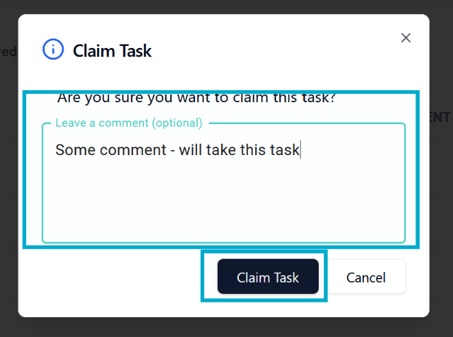 If you click claim task – that means you will take responsibility for that task and only you will be able to enter data. After you click Claim task you will get pop-up window where you can insert a comment, and you need to submit your decision: