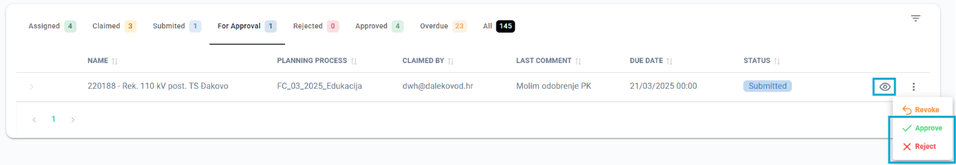 - For approval – list of tasks that have been submitted to you, with options to approve/reject them