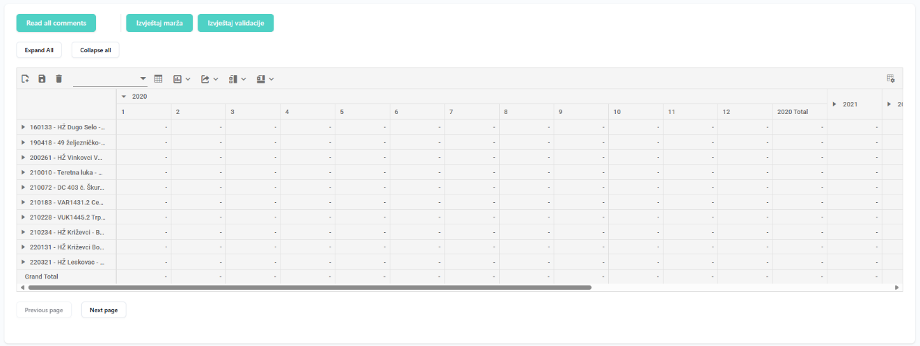- If there is too much data to fit into the table, data will automatically be separated into pages, you can go through pages by using "Previous page" and "Next page" buttons